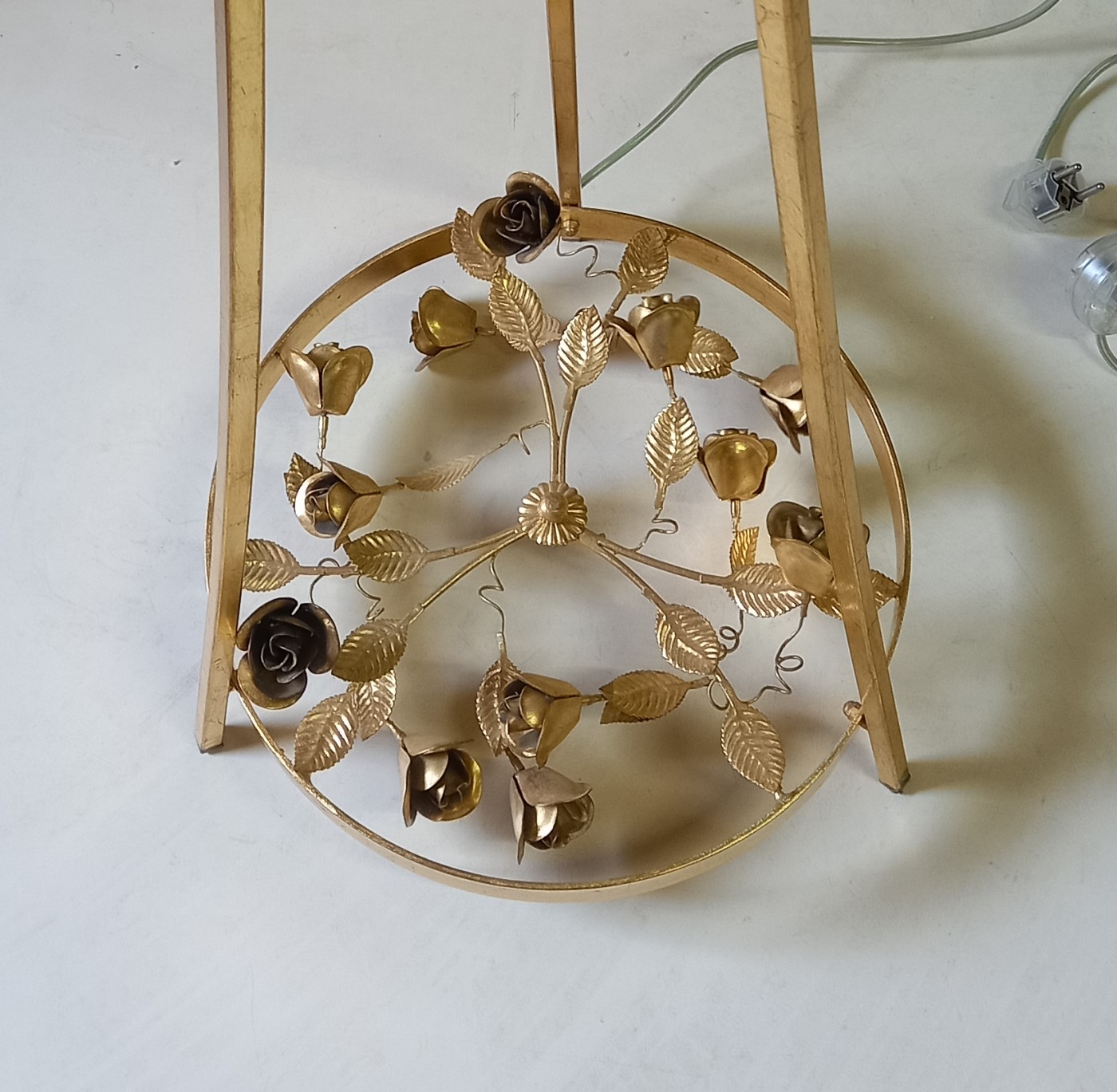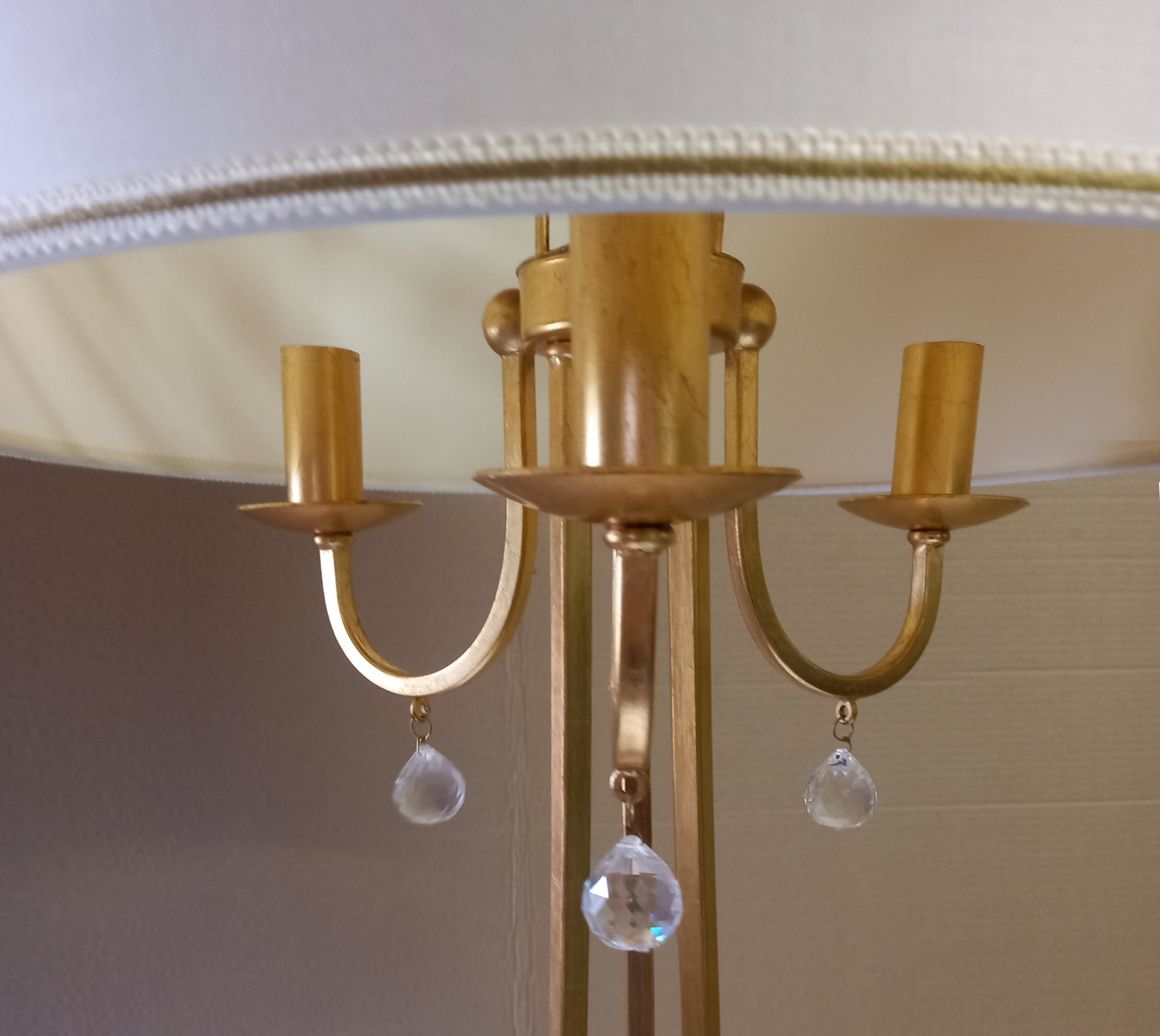 Торшер MM Lampadari 6988/LT3+1 00 V1669 из серии PARIS выполнен из металла золотого цвета. Четыре световых элемента расположены под абажуром из ткани белого цвета (3 цоколя Е14 и 1 Е27). Декорирован элементами в виде листьев и стеблей, обработанных методом воздушно-плазменной резки металла и керамическими розочками черного цвета, а также украшен подвесками из хрусталя Swarovski.