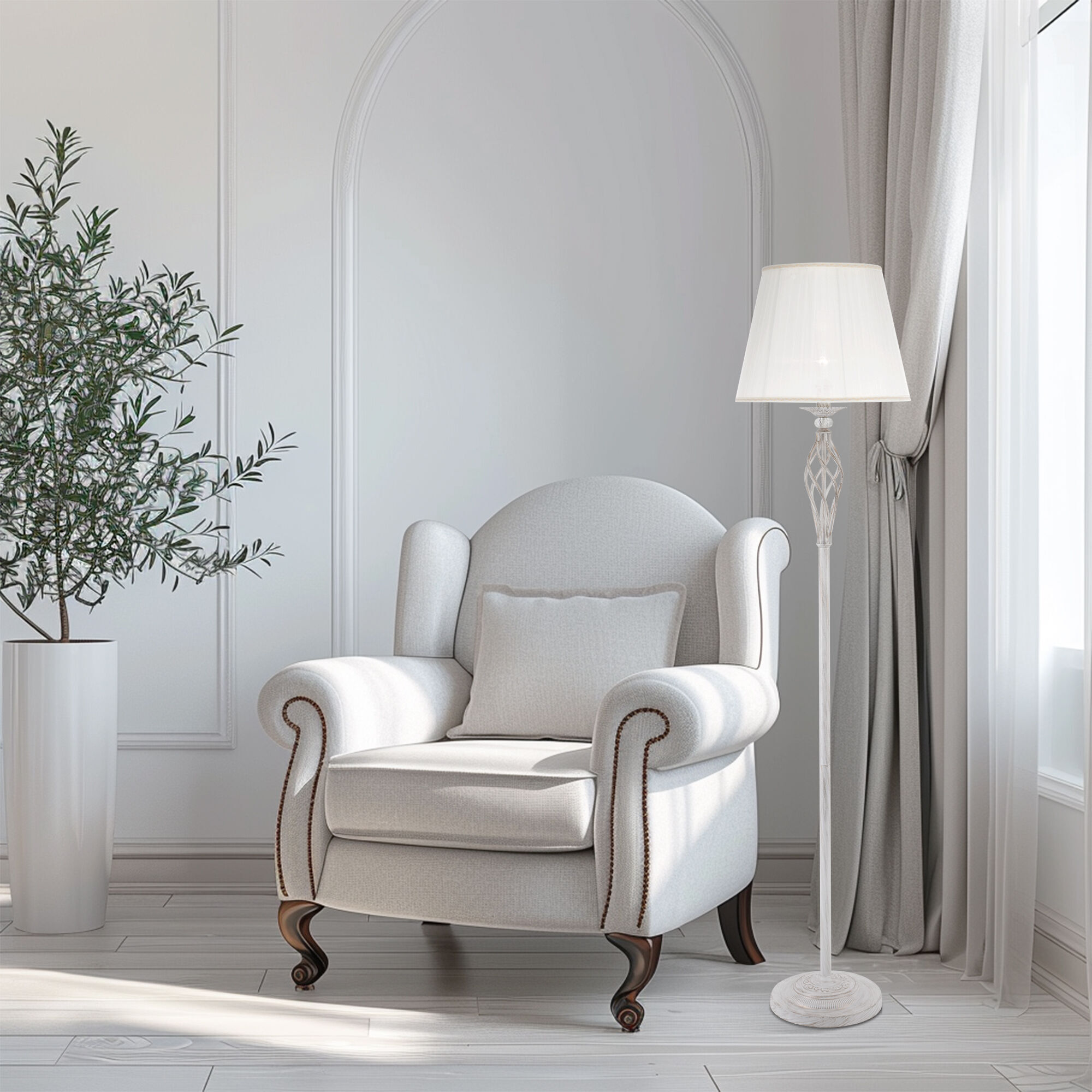 Благодаря белому тканевому абажуру напольный светильник создает мягкое равномерное свечение. Прочный металлический корпус светильника устойчив к механическим воздействиям, а защитное покрытие обеспечивает надежную электроизоляцию и презентабельный внешний вид.