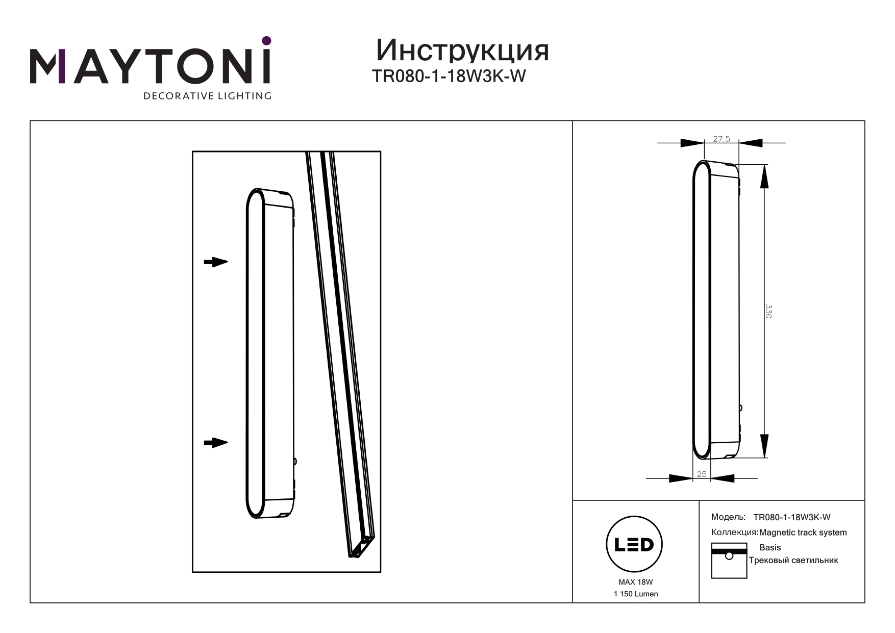Трековый магнитный светильник Technical Basis TR080-1-18W3K-W в Ялте