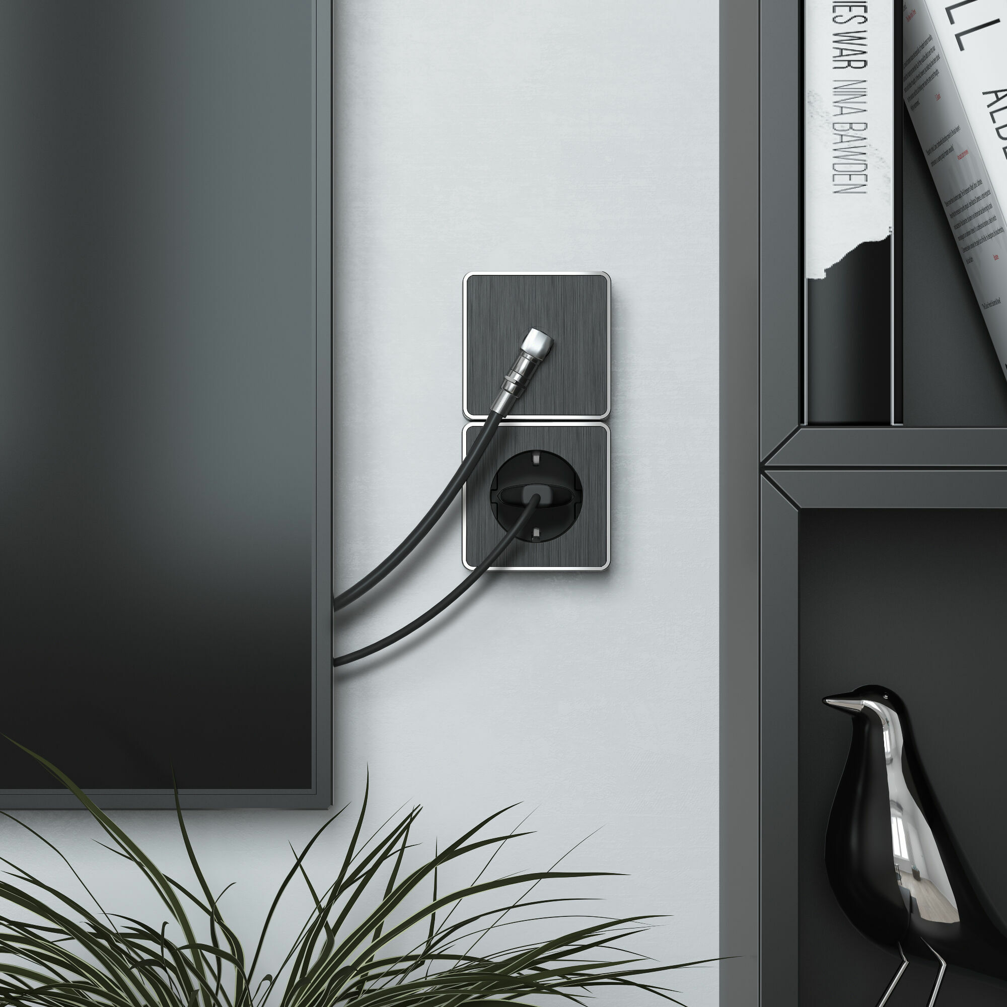 Накладной механизм не требуют дополнительных работ по монтажу отверстий и его можно устанавливать на любые поверхности. Фактурная рифленая поверхность имитирует шлифованный металл, а декоративная хромированная вставка подчеркивает строгую форму и добавляет розетке оригинальности.