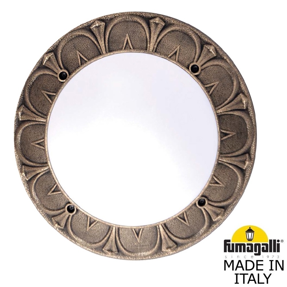 Уличные бра FUMAGALLI серии RITA прекрасно подойдут для архитектурного и декоративного освещения коттеджей, загородных домов, садовых беседок, зданий, в "классическом", или "пушкинском" стиле. Круглый светильник "тарелка" для установки на стену или потолок. Светильник подходит для монтажа, как с наружи, так и внутри помещения в качестве основного или декоративного источника освещения. Изготовлены в Италии, по уникальным технологиям "FUMAGALL" из современного композитного полимера RESIN. Этот материал в 5 раз прочнее металла, не ржавеет, не окисляется, не выгорает на солнце, его не нужно красить. Все светильники пыле-влаго защищены по стандарту IP66 (Пыленепроницаемые, защита от водяных струй с любого направления под давлением). Рассеиватель выполнен из антивандального, не мутнеющего и не горючего PMMA. Срок службы светильника - не менее 20 лет. Температура использования от -60 до +90. При заказе требуется выбрать цвет корпуса.