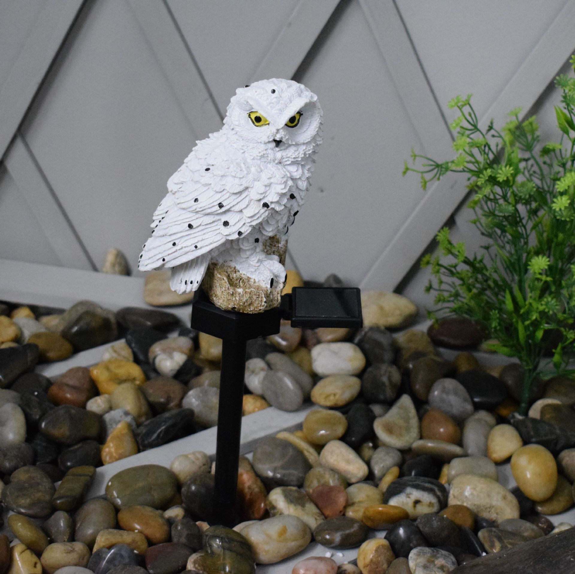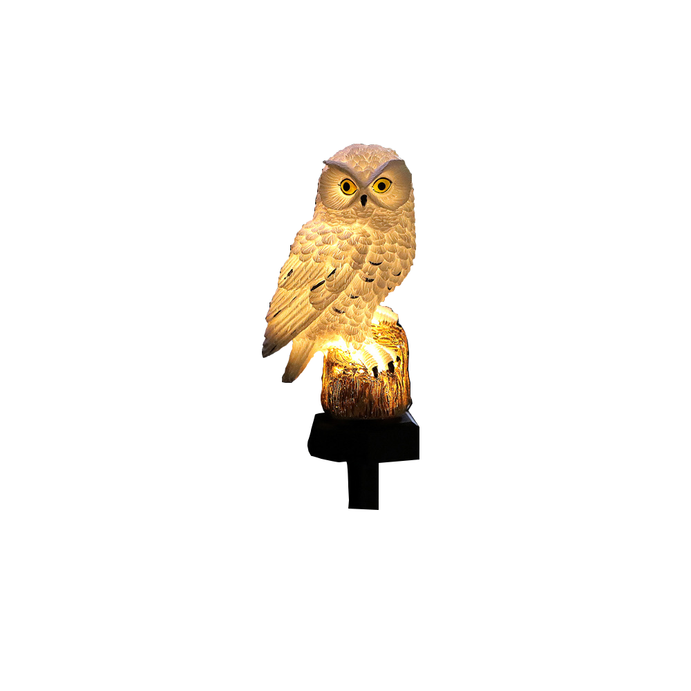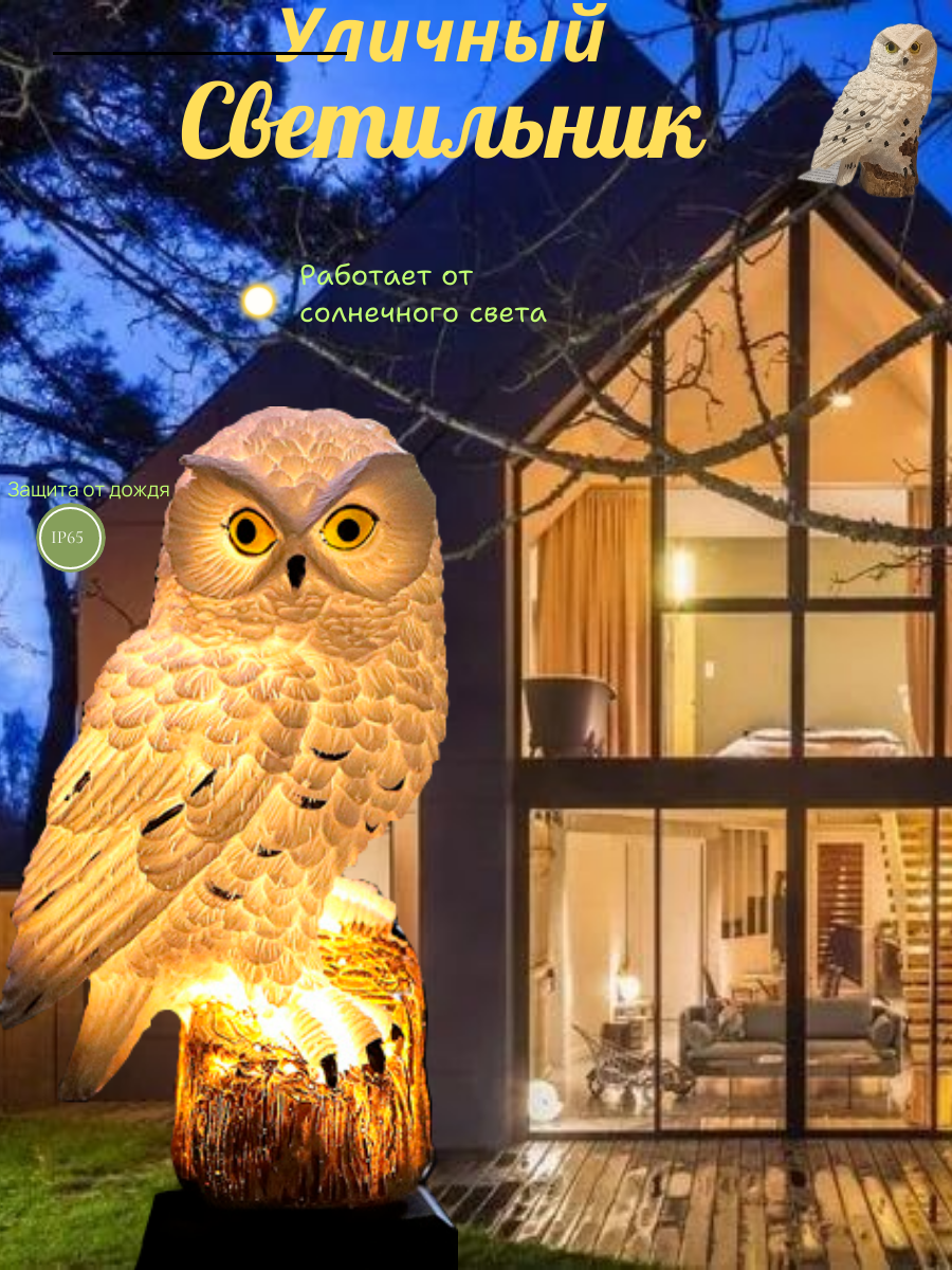 Дизайн выполнен из высококачественного абс- пластика и полистоуна, устойчивого к атмосферным воздействиям. Цветовая температура светильника составит 2700К . Перья совы детально проработаны, а глаза выполнены из светопропускающего материала, создавая мягкий, уютный свет.