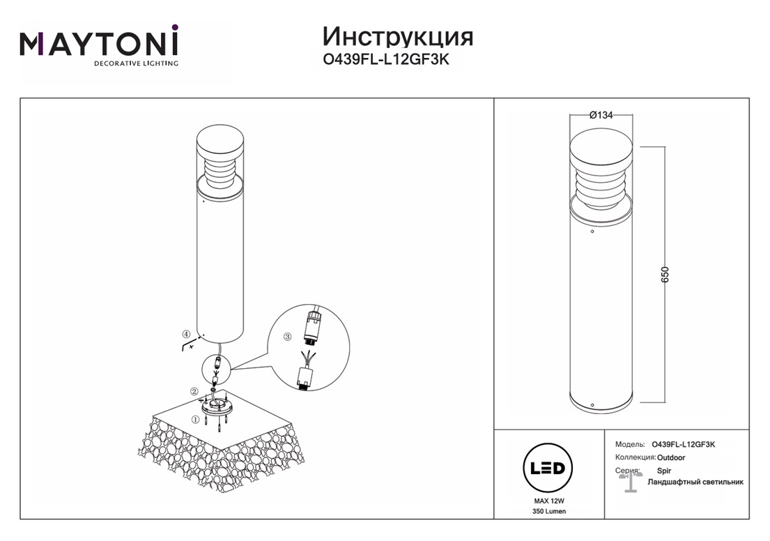 Уличный ландшафтный светодиодный светильник Maytoni Spir O439FL-L12GF3K — это идеальное решение для вашего сада, подъездной дороги или террасы. Этот элегантный светодиодный светильник не только обеспечивает отличное освещение, но и добавляет стиль и атмосферу вашему открытому пространству. Светильник выполнен в современном дизайне, который прекрасно вписывается в любой ландшафт. Его прочная конструкция защищена от пыли и влаги, что делает его долговечным в любых погодных условиях. Maytoni Spir O439FL-L12GF3K обладает ярким и равномерным светом, который не раздражает глаза и создаёт уютную атмосферу для вечернего отдыха на свежем воздухе. Устанавливается светильник легко и быстро, а его экономичные светодиоды значительно снижают потребление электроэнергии. Вы сможете наслаждаться красотой ночного сада или освещённой дорожкой, не беспокоясь о больших счетах за электричество. Этот светильник станет не только функциональным элементом вашего экстерьера, но и стильным акцентом, который подчёркивает вашу заботу о деталях. Выберите Maytoni Spir O439FL-L12GF3K для обеспечения безопасного и комфортного внешнего освещения, которое соответствует всем вашим ожиданиям. Данную модель O439FL-L12GF3K спешите купить в интернет-магазине 220svet.