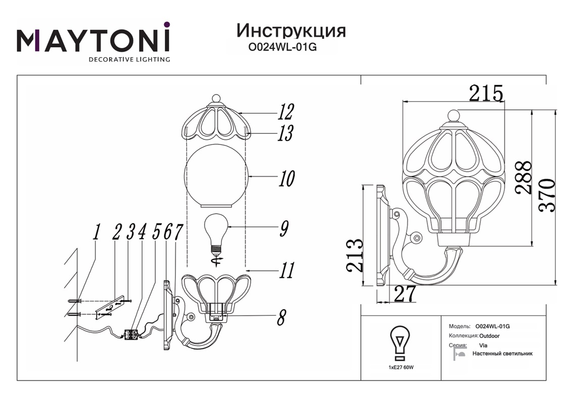 Уличный настенный светильник Maytoni Via O024WL-01G в Ялте