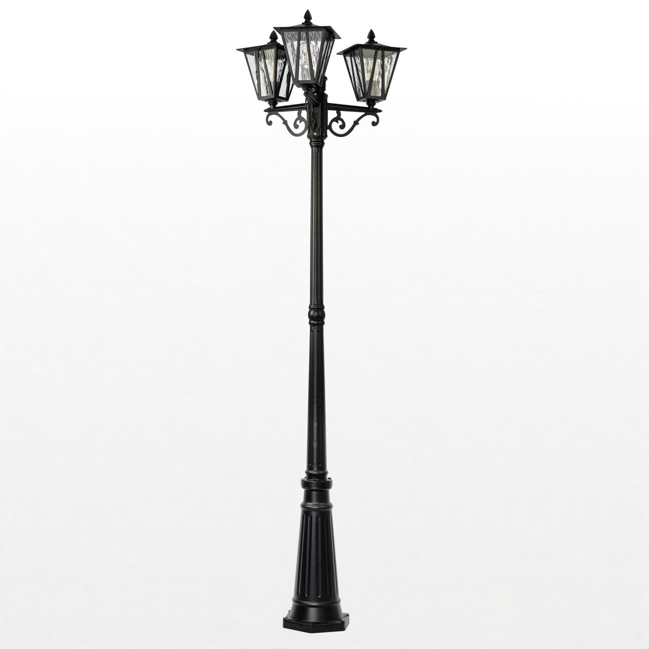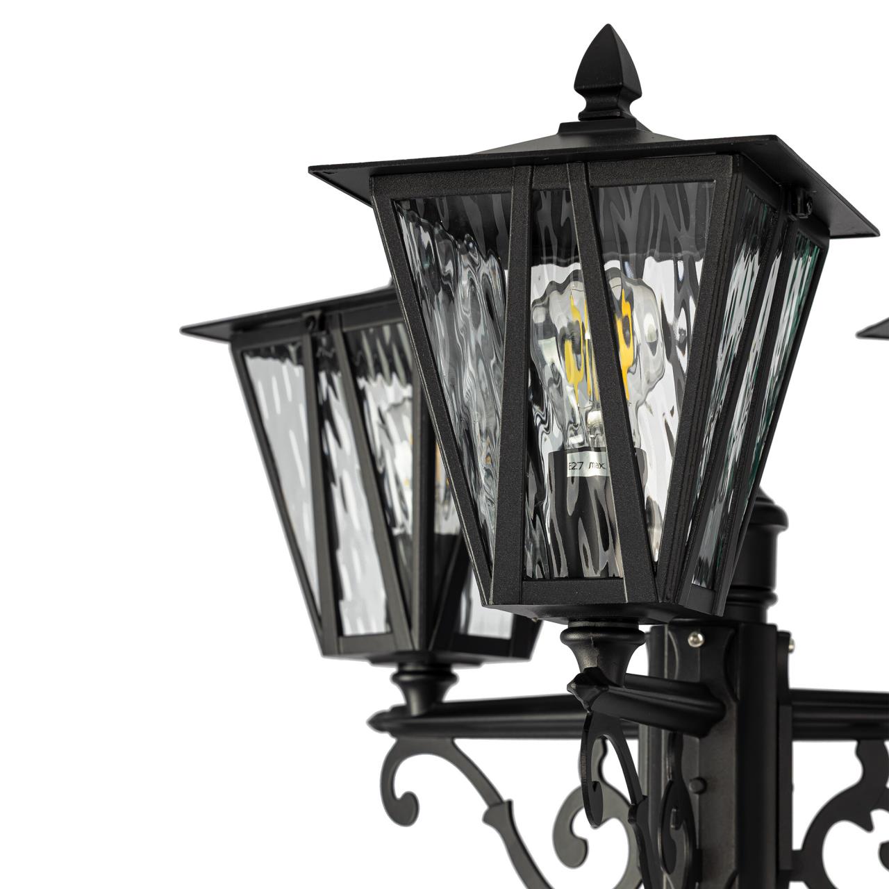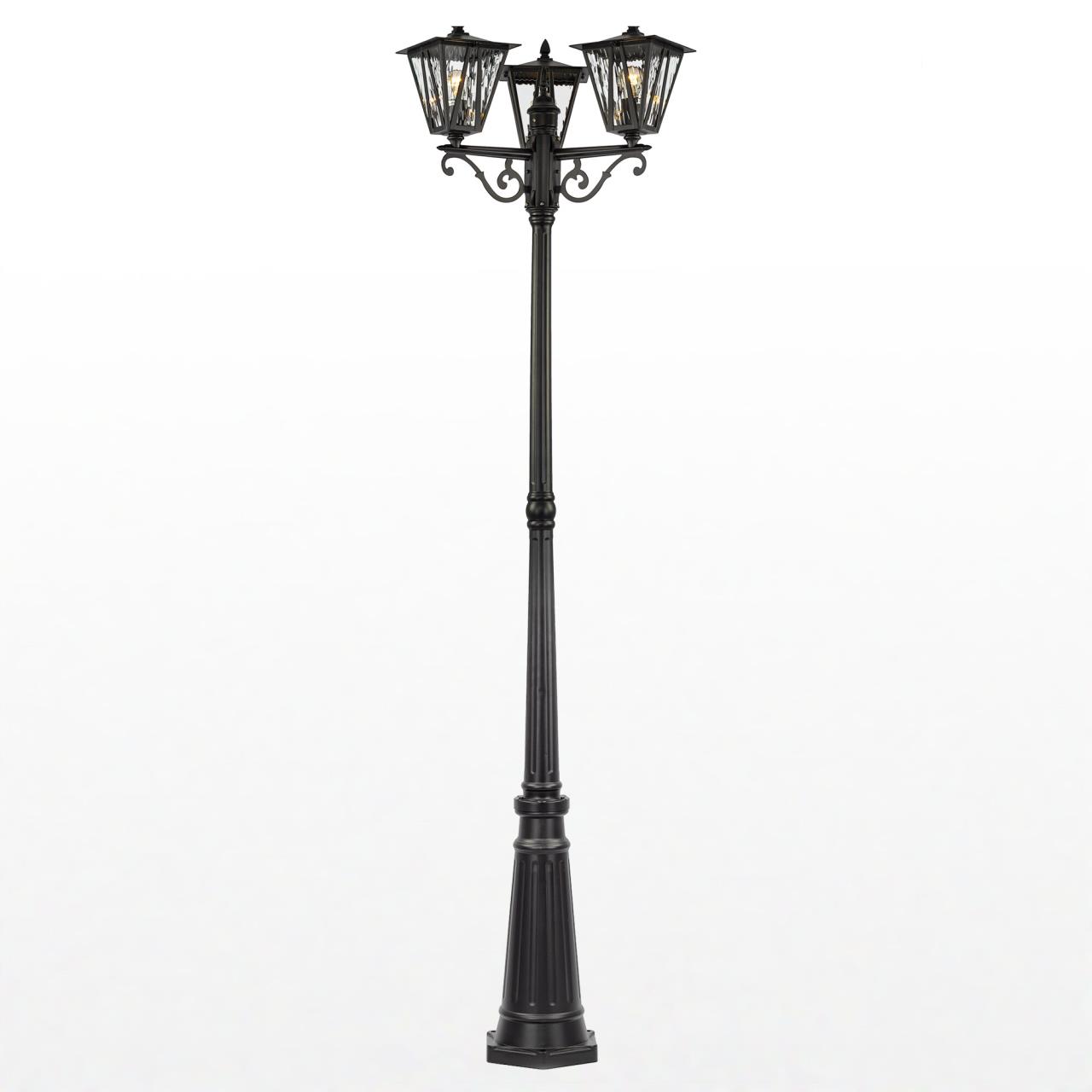 Садово-парковый светильник Citilux FORTS CLU09P3 выполнен в стиле современной классики. Модель отличается массивной конструкцией с тремя плафонами. Каждый из них в форме перевёрнутой усечённой пирамиды, дополнен оригинальной раскладкой и прозрачным волнистым стеклом. Металлический корпус покрыт чёрной матовой текстурной краской.