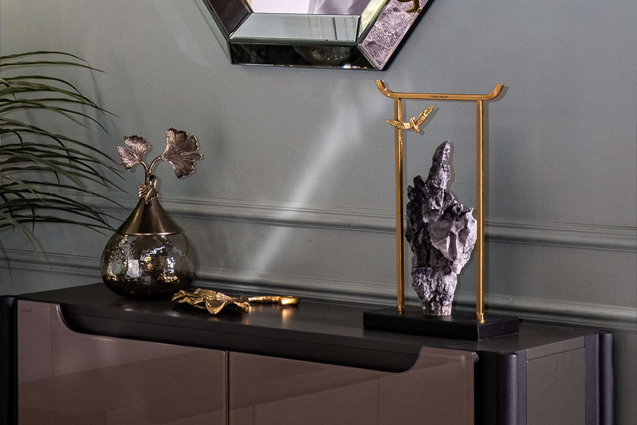 Текстурированное стекло в компании с алюминиевыми листочками гинкго создают потрясающий эффект. Ваза выглядит дорого, но при этом совершенно не утяжеляет интерьер, не выбивается из общей концепции ар-деко. Благодаря крышке она может с легкостью брать на себя функции шкатулки для украшений и мелочей. Красиво смотрится в компании других ваз из этой серии.