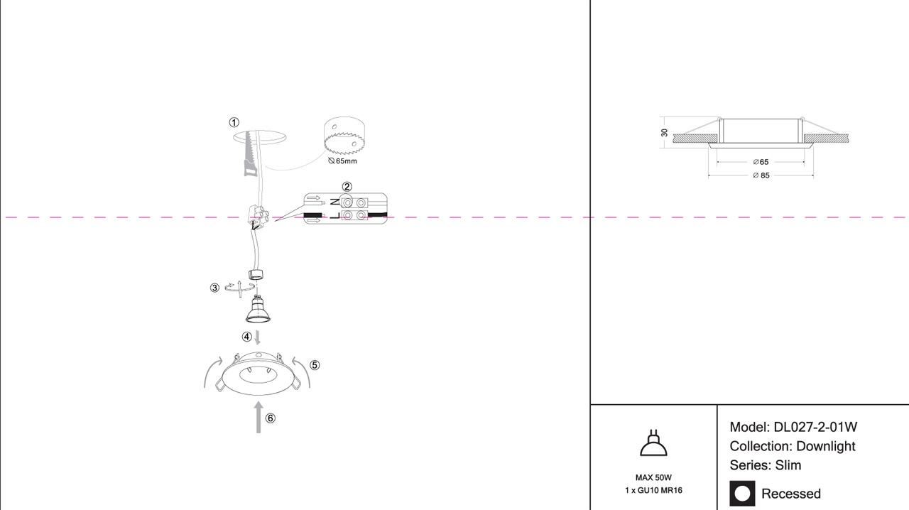 - Диаметр врезного отверстия: 65 мм (6.5 см)