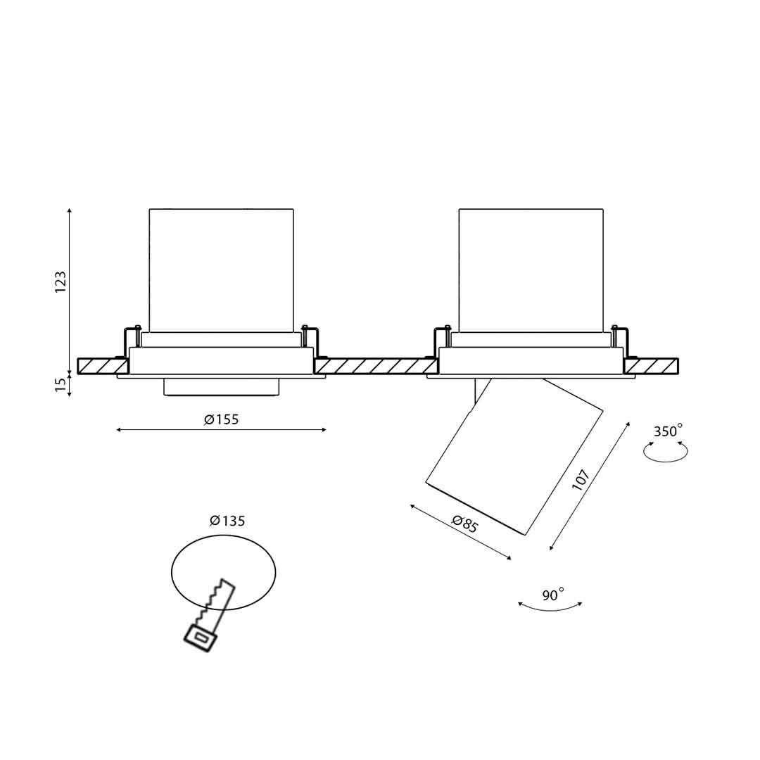 - Диаметр врезного отверстия: 135 мм (13.5 см)