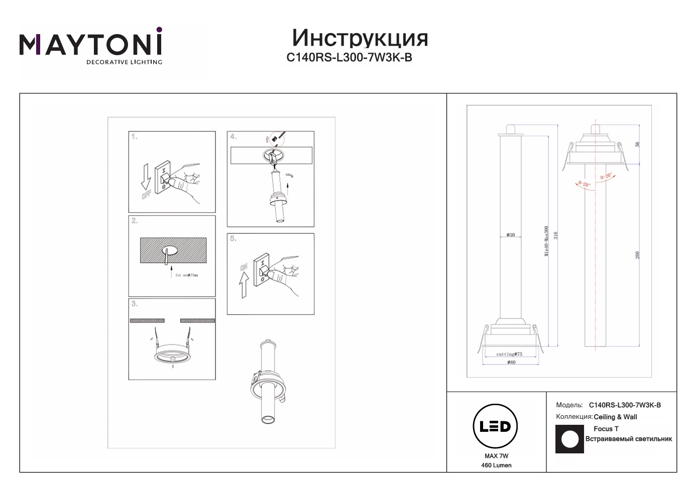 Встраиваемый светодиодный светильник Maytoni Focus T C140RS-L300-7W3K-B — это модель, которая воплощает гармонию формы и функции. Благодаря источнику света с типом цоколя LED и мощностью 7 Вт, а также цветовой температуре 3000 К, этот осветительный прибор обеспечивает комфортное и равномерное освещение на площади в 1 квадратный метр, создавая уютную атмосферу в вашем доме. Световой поток равен 460 Лм.