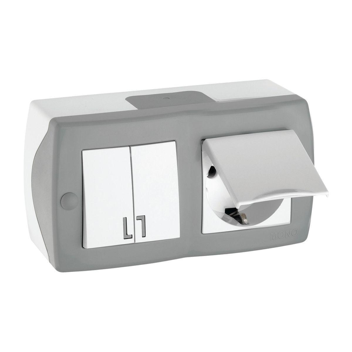 Купить "Выключатель - розетка Mono Electric Octans IP20 двухклавишный - 2К+З с крышкой бело-серый 104-020001-187"